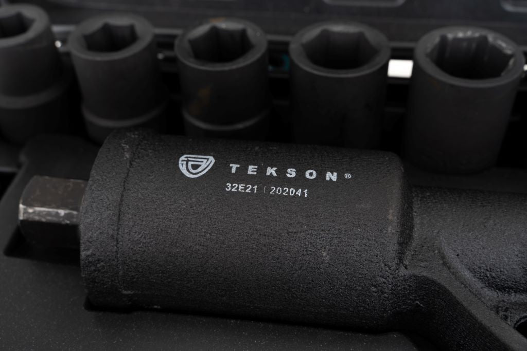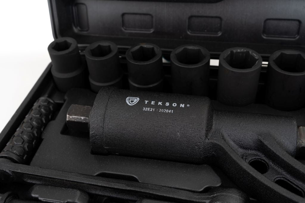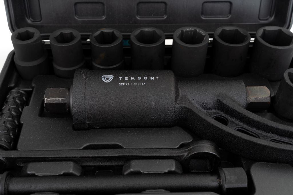 - Schwarzer, robuster Koffer mit allen Komponenten des Sets: Drehmomentschlüssel, Steckschlüsselaufsätzen 21, 24, 27, 30, 32, 33, 38 mm und Schutzhandschuhe